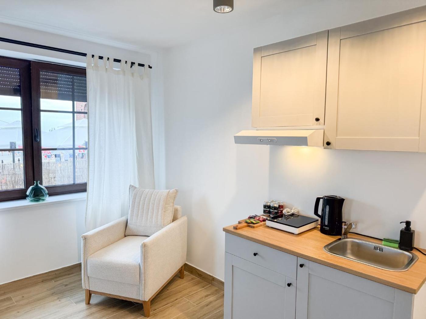 Studio typu Deluxe. Offering free toiletries, this studio includes a private bathroom with a shower and a hairdryer. In the kitchenette, guests will find a stovetop, a refrigerator and kitchenware. The studio has tiled floors, a seating area with a flat-screen TV, a tea and coffee maker, a wardrobe as well as sea views. The unit has 1 bed. Studio - 2 osobowy. Powierzchnia pokoju ok.: 24 mkw. ;